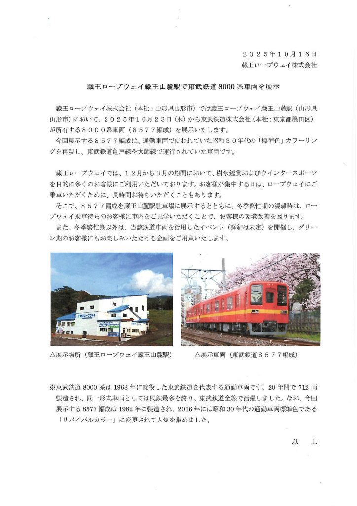 蔵王山麓駅で東武鉄道8000系車両を展示